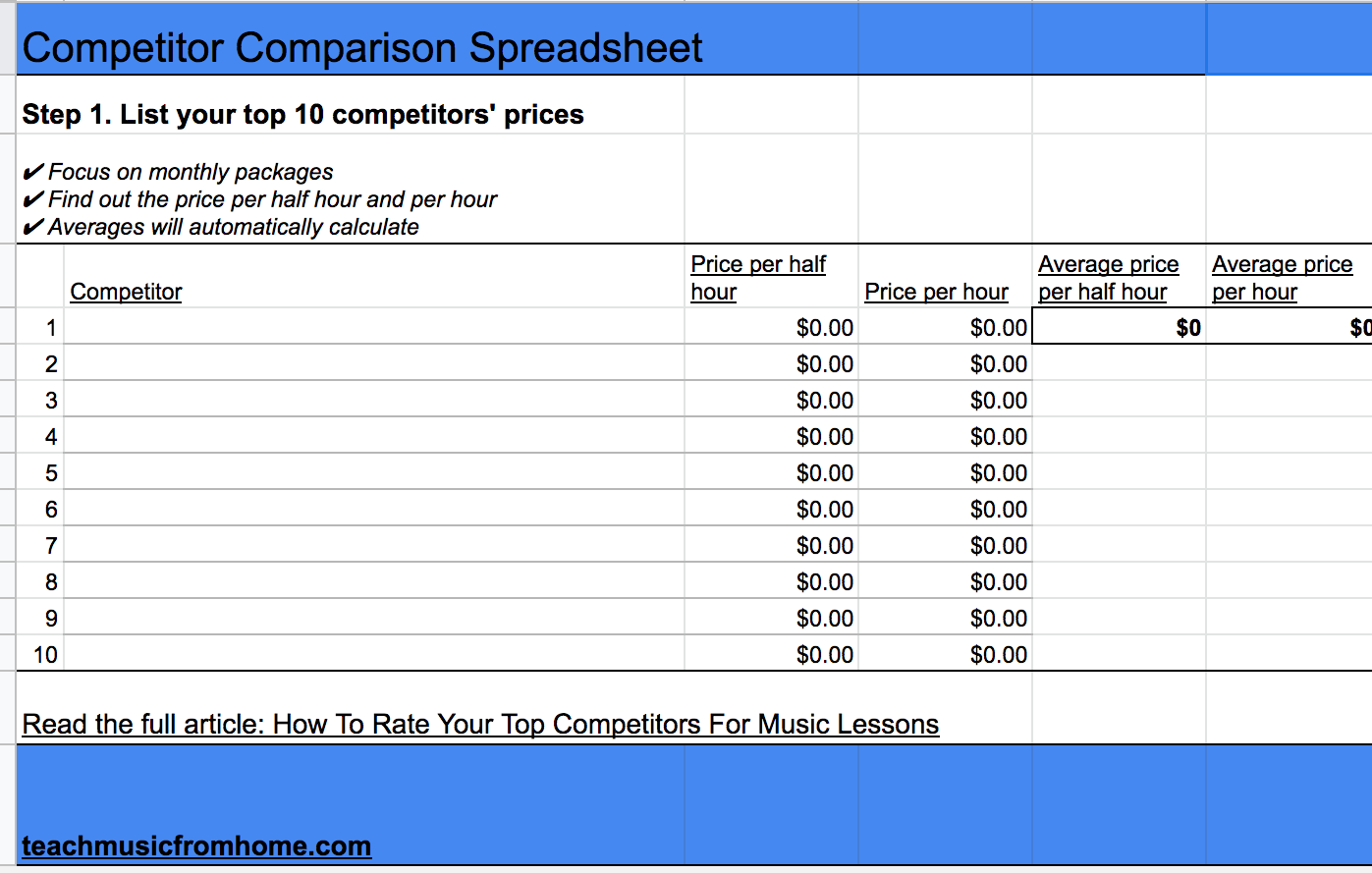 30 minute lessons are usually the shortest session length music teachers provide. These are easier to sell than hour sessions because they are cheaper and more convenient. How much does each of your top ten competitors charge for a half hour lesson?